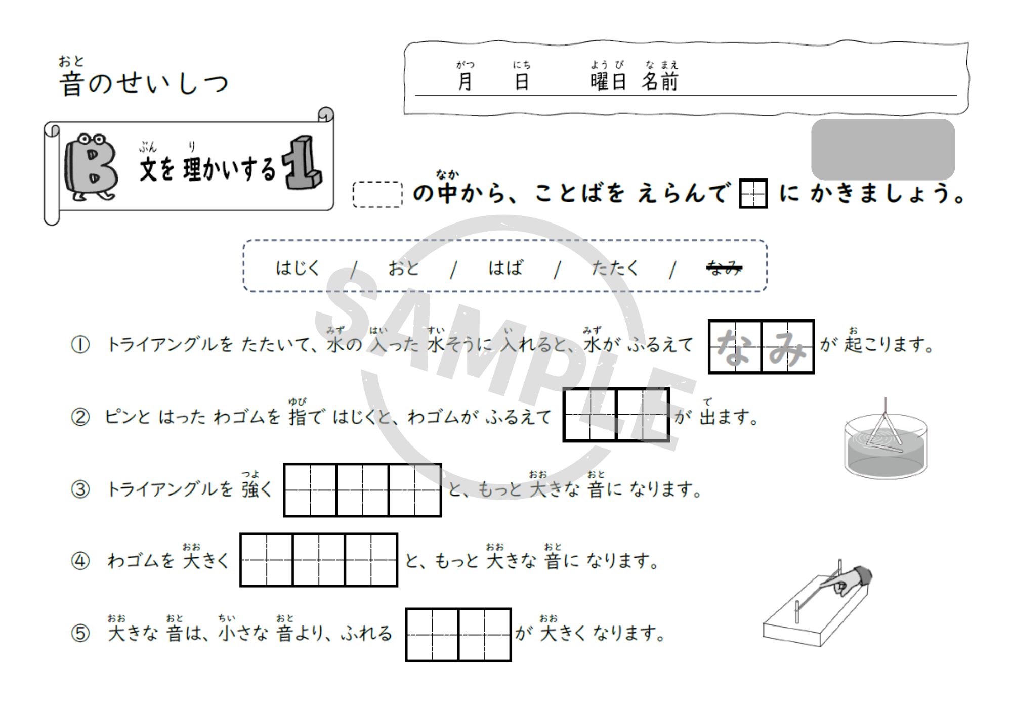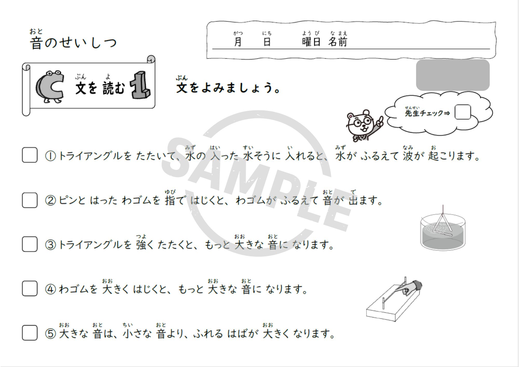 小学3年理科「音のせいしつ」単元用の教材で、